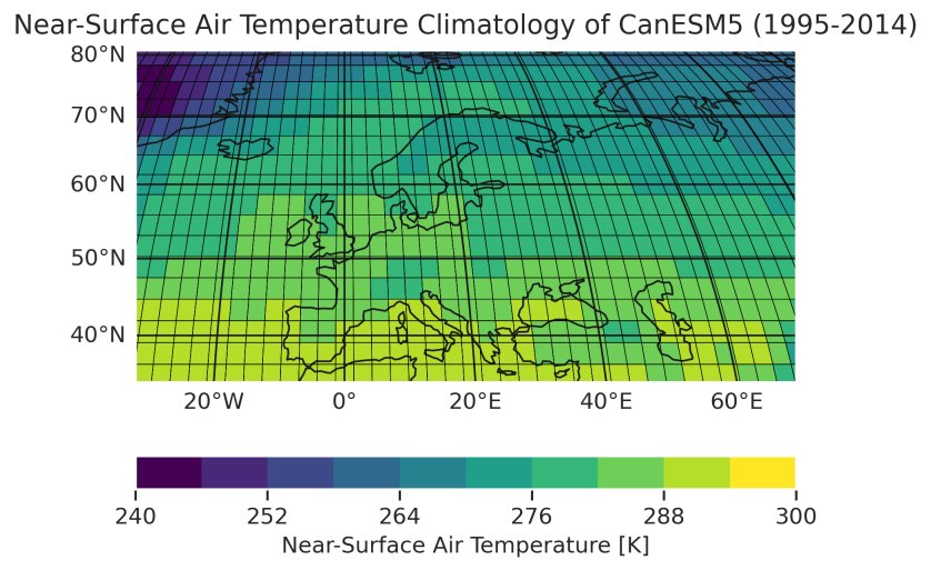 Fig. 404 Historical near-surface air temperature climatology over Europe simulated by CanESM5 between 1995 and 2014. The plot visualizes the invidividual rectangular grid cells of the model’s regular grid.#