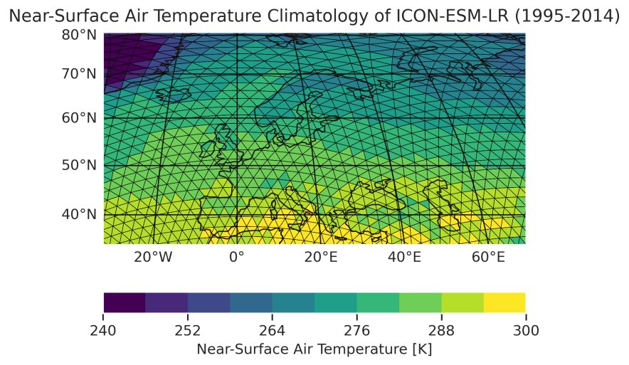 Fig. 405 Historical near-surface air temperature climatology over Europe simulated by ICON-ESM-LR between 1995 and 2014. The plot visualizes the invidividual triangular grid cells of the model’s unstructured grid.#