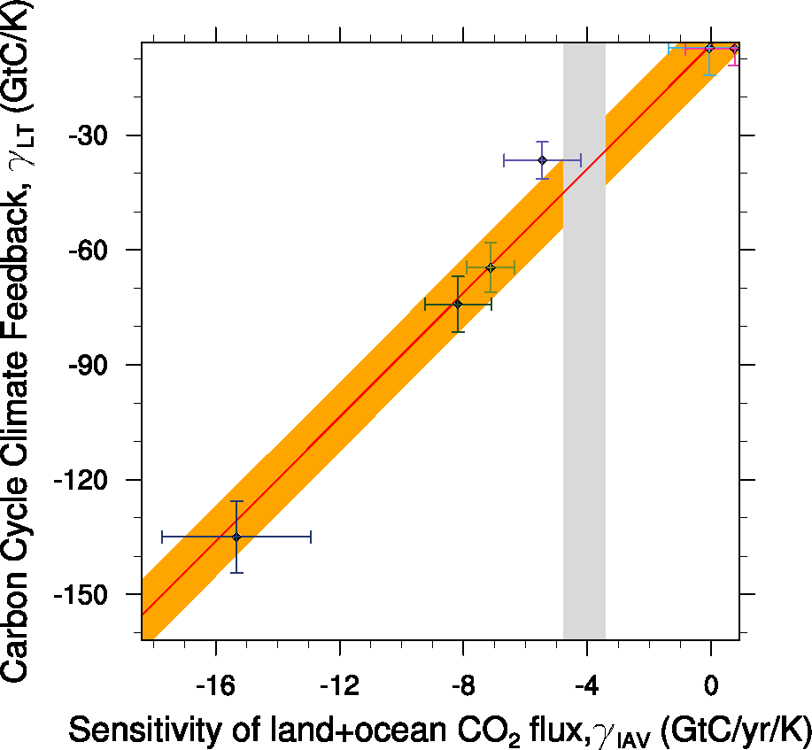 Fig. 419 Carbon cycle-climate feedback of tropical land carbon vs. the sensitivity of co2flux to interannual temperature variability in the tropics (30S to 30N). The red line shows the linear best fit of the regression together with the prediction error (orange shading) and the gray shading shows the observed range.#