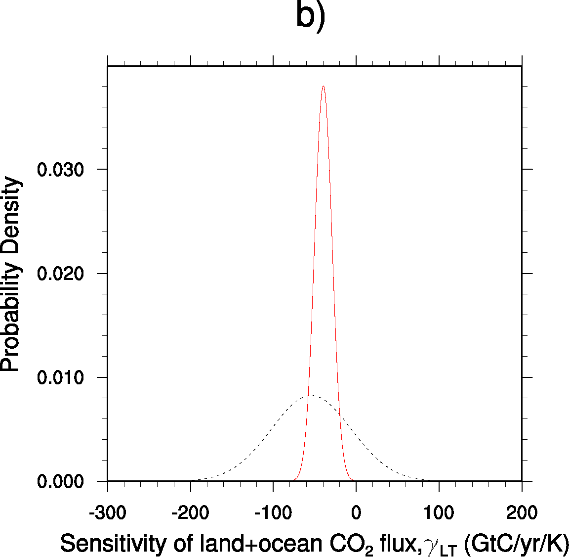 Fig. 420 Probability Density Functions for the pure CMIP5 ensemble (black dashed) and after applying the observed constraint to the models (red solid)#