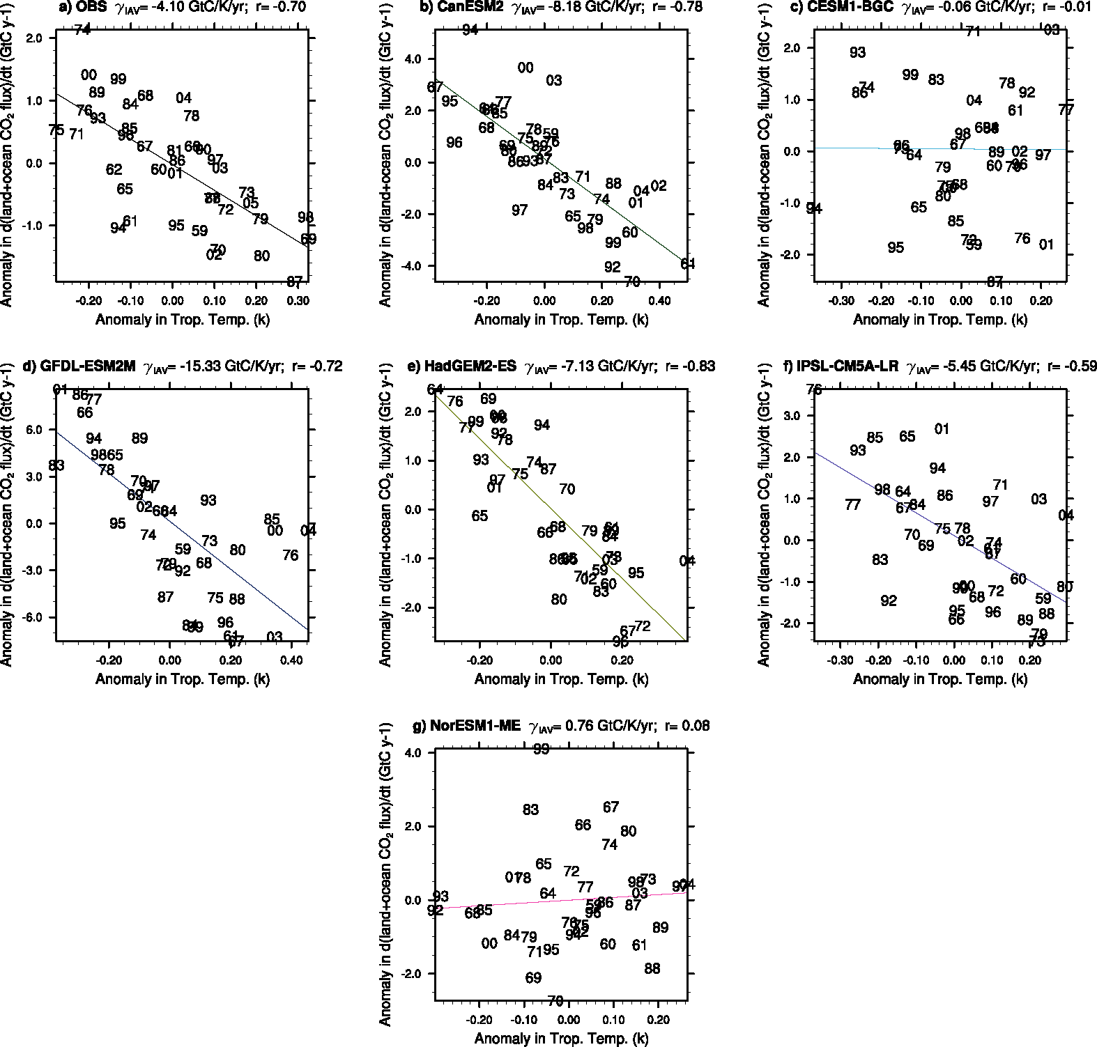 Fig. 418 Correlations between the interannual variability of global co2flux (nbp+fgco2) and tropical temperature for the individual CMIP5 models using esmHistorical simulations, and for observations.#