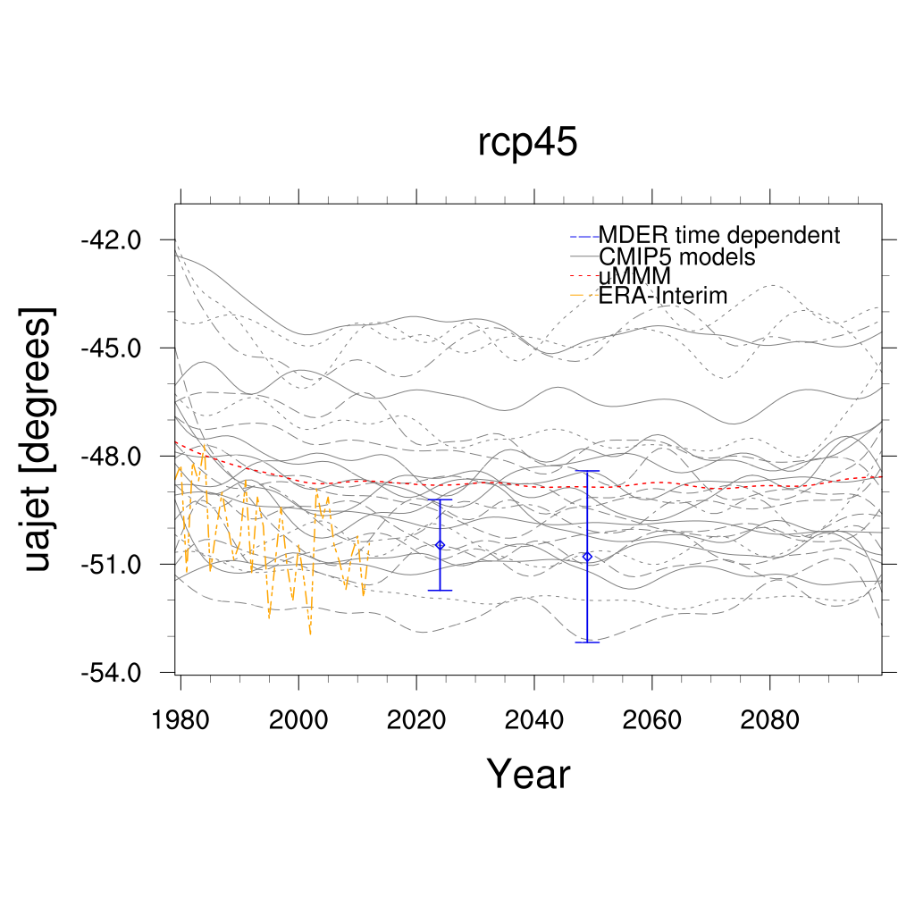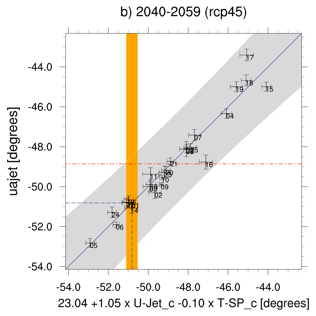 Wenzel et al. (2016) use multiple ensemble diagnostic regression (MDER) to constrain the CMIP5 future projection of the summer austral jet position with several historical process-oriented diagnostics and respective observations.