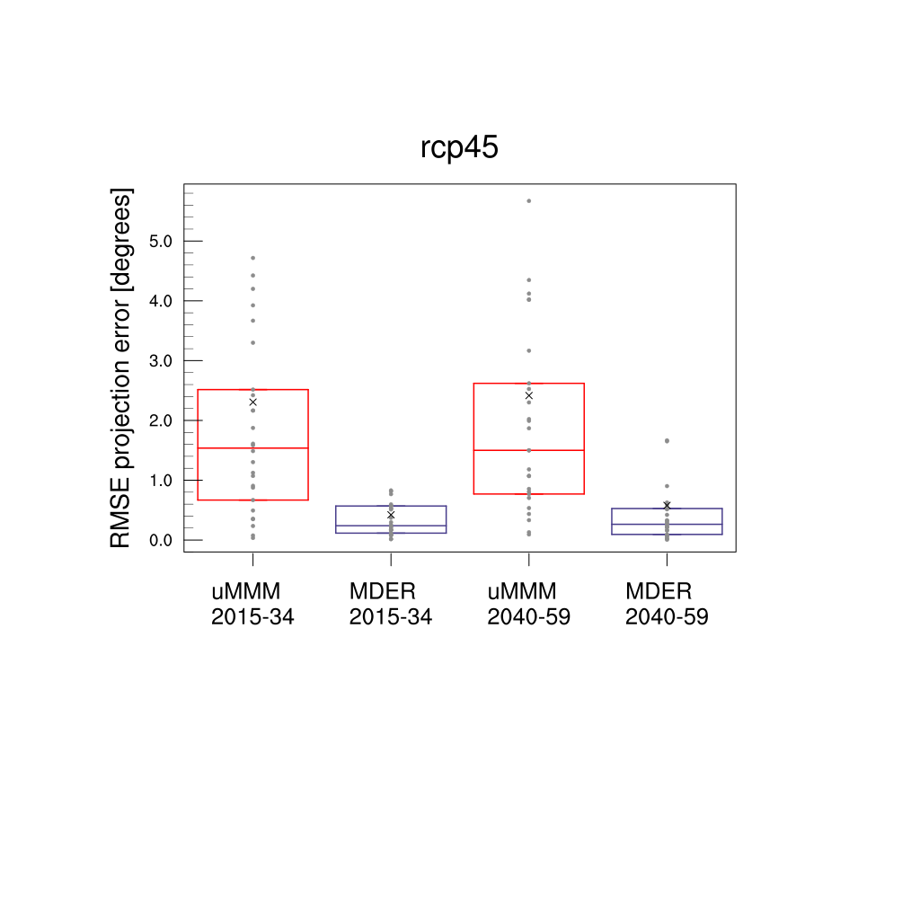 Fig. 423 Boxplot for the RMSE of the target variable for the unweighted and (MDER) weighted multi-model mean projections in a pseudo-reality setup.#