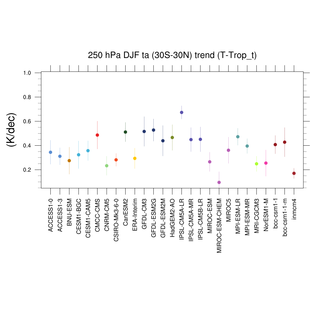 Fig. 424 Trends in tropical DJF temperature at 250hPa for different CMIP5 models and observations.#