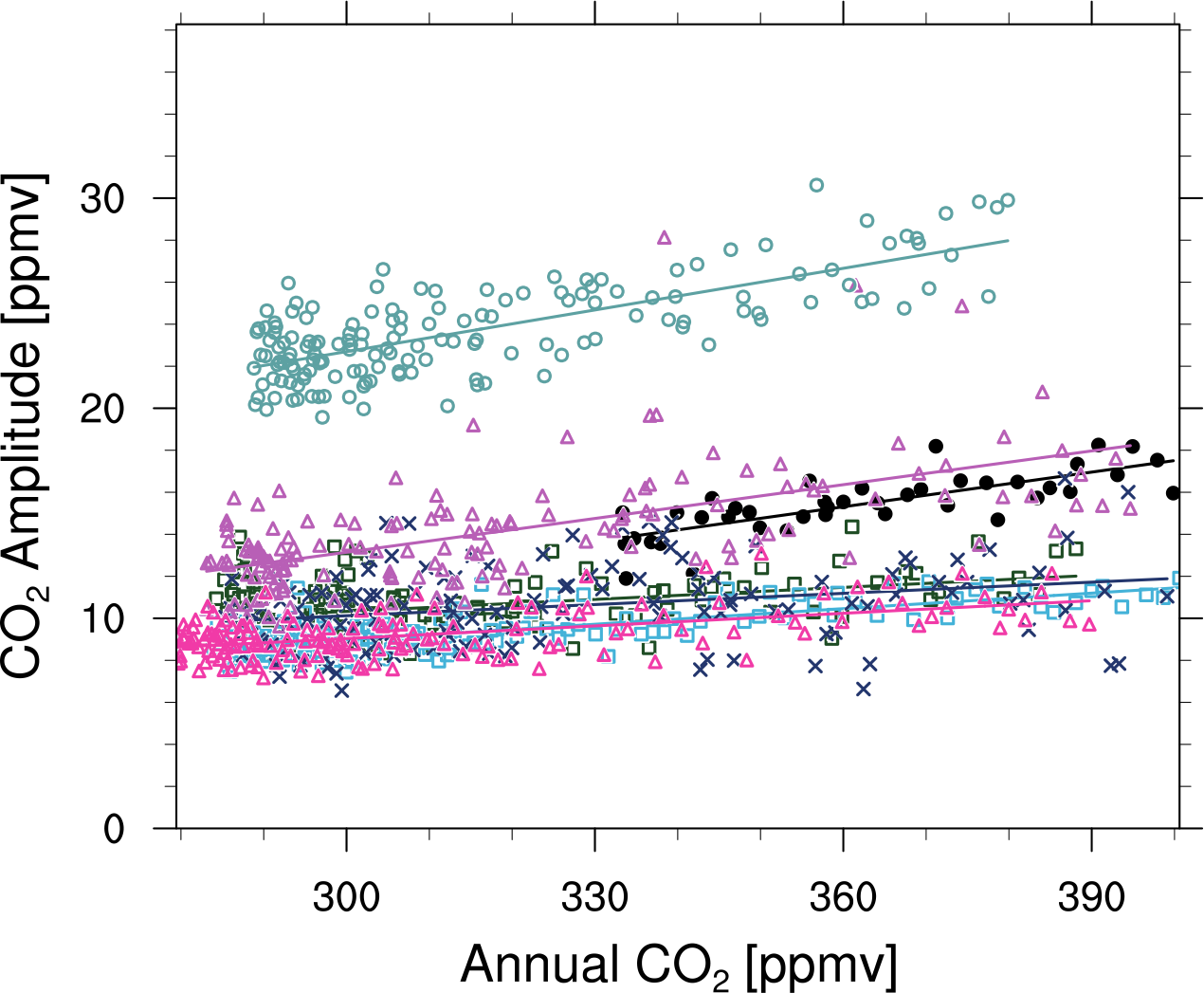Fig. 426 Comparison of CO2 seasonal amplitudes for CMIP5 historical simulations and observations showing annual mean atmospheric CO2 versus the amplitudes of the CO2 seasonal cycle at Pt. Barrow, Alaska (produced with carbon_co2_cycle.ncl, similar to Fig. 1a from Wenzel et al. (2016)).#