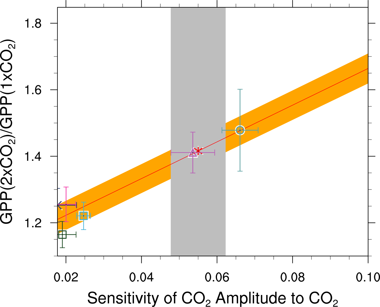 Fig. 428 Emergent constraint on the relative increase of large-scale GPP for a doubling of CO2, showing the correlations between the sensitivity of the CO2 amplitude to annual mean CO2 increases at Pt. Barrow (x-axis) and the high-latitude (60N - 90N) CO2 fertilization on GPP at 2xCO2. The red line shows the linear best fit of the regression together with the prediction error (orange shading), the gray shading shows the observed range (produced with carbon_co2_cycle.ncl, similar to Fig. 3a from Wenzel et al. (2016)).#