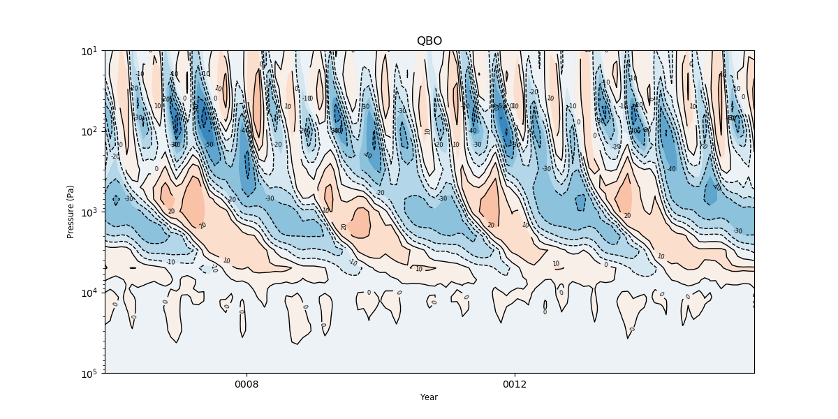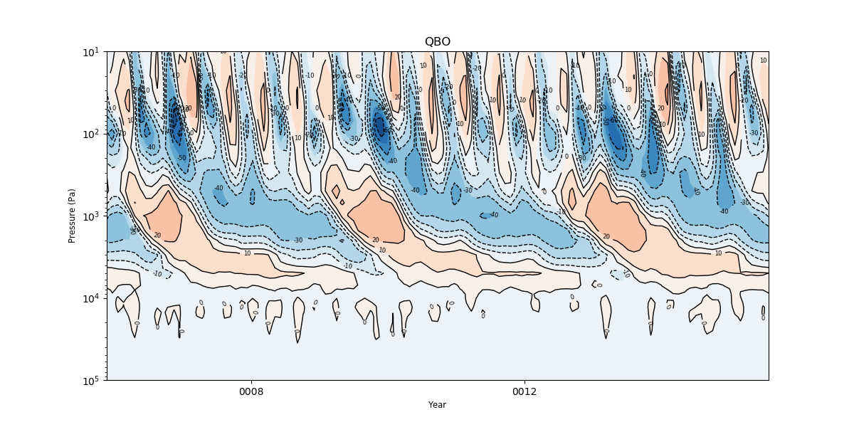 The Quasi-Biennial Oscillation (QBO) is a good measure of tropical variability in the stratosphere. Zonal mean zonal wind at 30hPa is used to define the period and amplitude of the QBO.