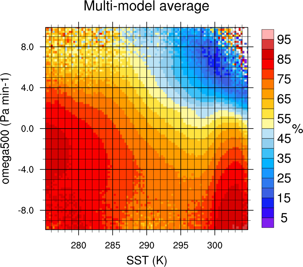 Fig. 148 2-dimensional distribution of average total cloud cover (clt) binned by sea surface temperature (SST, x-axis) and vertical velocity at 500 hPa (ω500, y-axis) averaged over 20 years and all grid cells over the ocean. Produced with recipe_lauer22jclim_fig8_dyn.yml (diagnostic script clouds_dyn_matrix.ncl).#