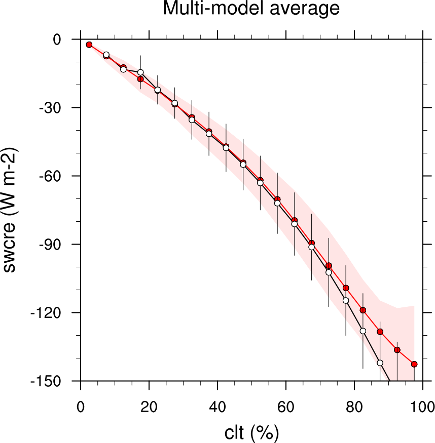 Fig. 146 Multi-year seasonal average (December-January-February) of cloud shortwave radiative effect (W m-2) vs. total cloud fraction (clt, %) averaged over the Southern Ocean defined as latitude belt 30°S-65°S (ocean grid cells only). Shown are the CMIP6 multi-model mean (red filled circles and lines) and observational estimates from ESACCI-CLOUD (black circles and lines). The red shaded areas represent the range between the 10th and 90th percentiles of the results from all individual models. Produced with recipe_lauer22jclim_fig9-11ab_scatter.yml (diagnostic script clouds_scatter.ncl).#