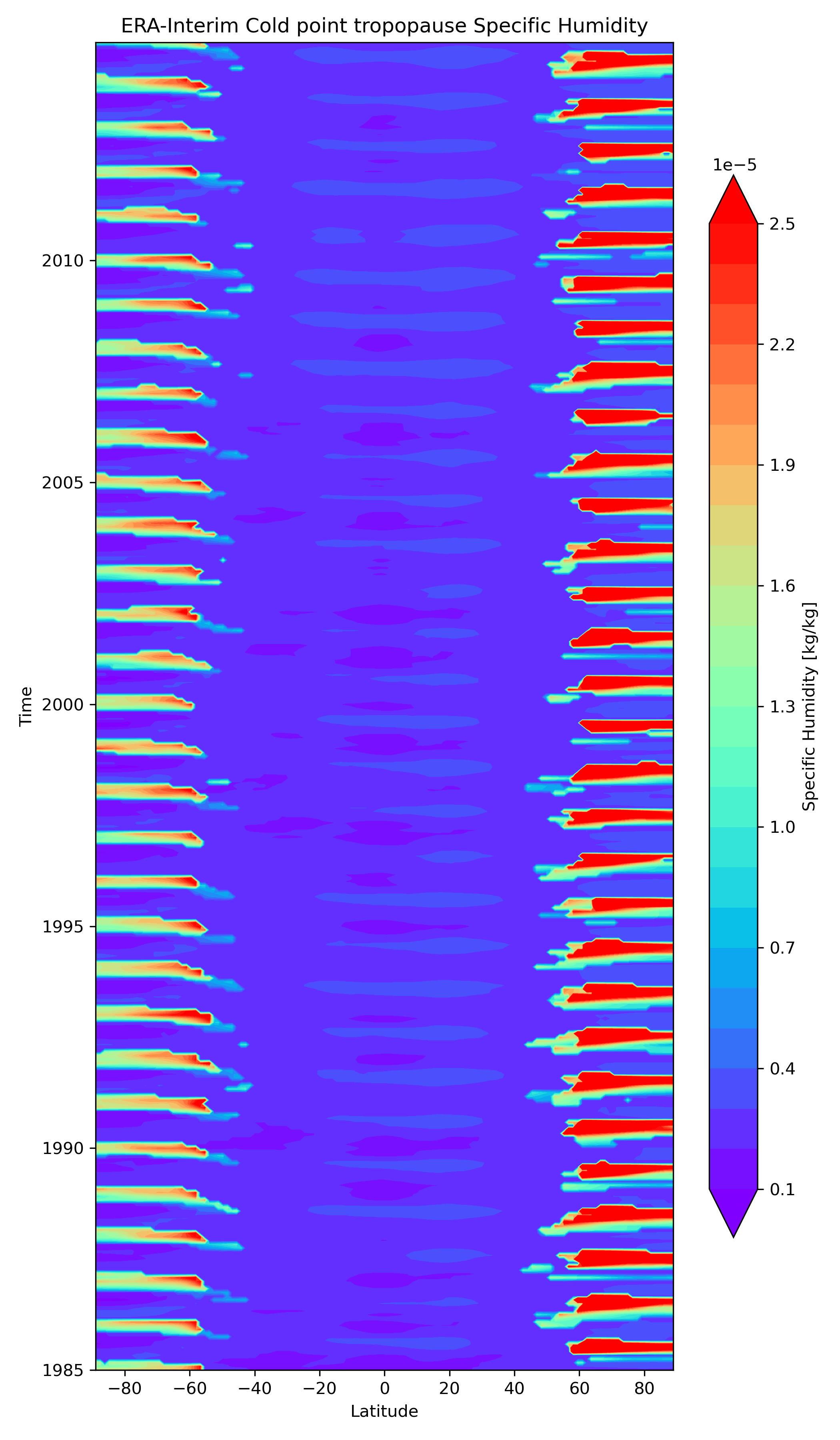 Fig. 151 Latitude versus time plot of the Specific Humidity (hus) at the cold point tropopause from ERA-Interim data.#