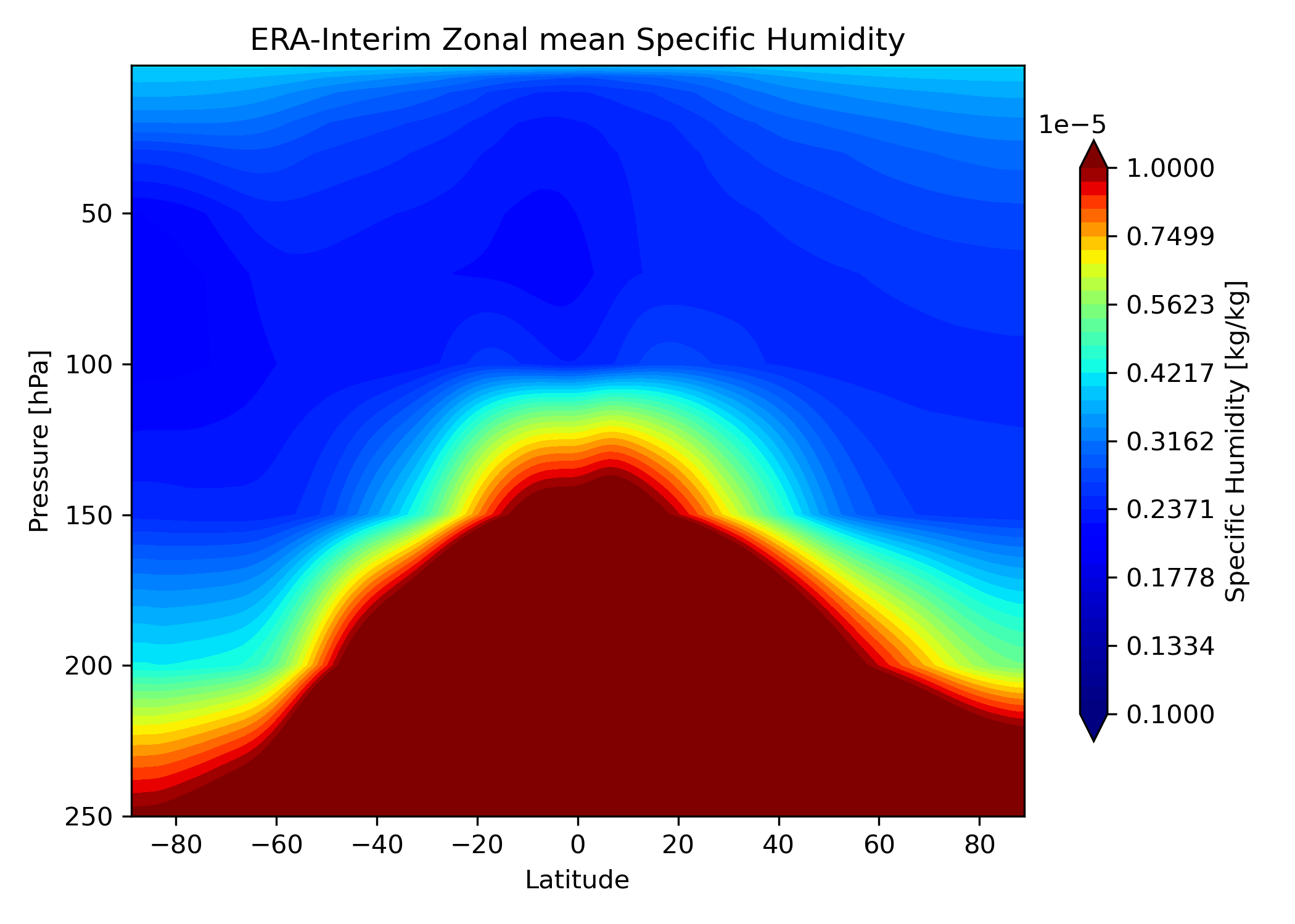The diagnostic diag_tropopause_zonalmean.py plots zonal mean for given variable for all pressure levels between 250 and 1hPa and at cold point tropopause height. Here Specific Humidity (hus) is used. This will be calculated from the ESACCI water vapour data CDR-3, which are planed to contain the vertically resolved water vapour ECV in units of ppmv (volume mixing ratio) and will be provided as zonal monthly means on the SPARC Data Initiative latitude/pressure level grid (SPARC, 2017; Hegglin et al., 2013). It covers the vertical range between 250 hPa and 1 hPa, and the time period 1985 to the end of 2019. The calculation of hus from water vapour in ppmv will be part of the cmorizer. Here, ERA-Interim data are used.