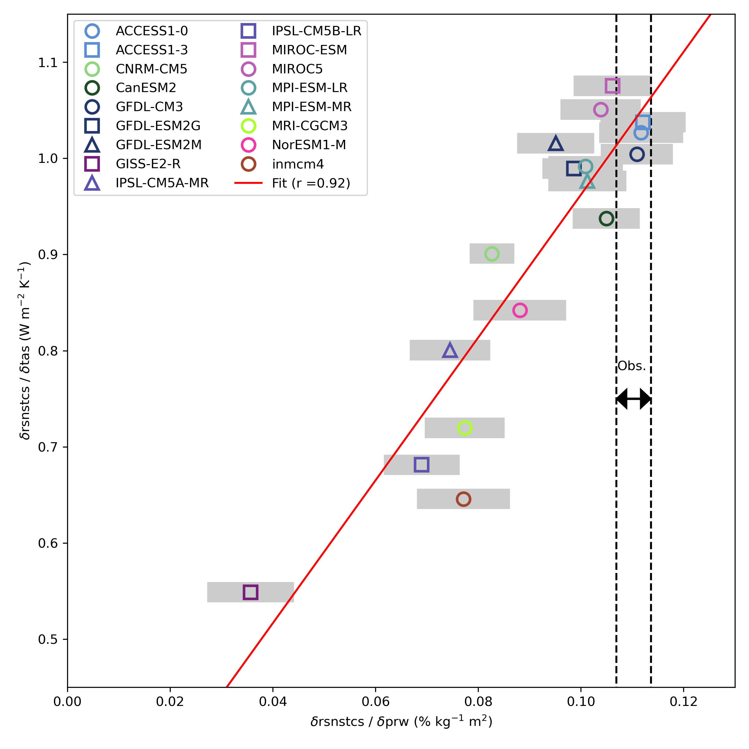 Fig. 149 Scatter plot and regression line computed between the ratio of the change of net short wave radiation (rsnst) and the change of the Water Vapor Path (prw) against the ratio of the change of netshort wave radiation for clear skye (rsnstcs) and the the change of surface temperature (tas). The width of horizontal shading for models and the vertical dashed lines for observations (Obs.) represent statistical uncertainties of the ratio, as the 95% confidence interval (CI) of the regression slope to the rsnst versus prw curve. For the prw observations ESACCI CDR-2 data from 2003 to 2014 are used.#