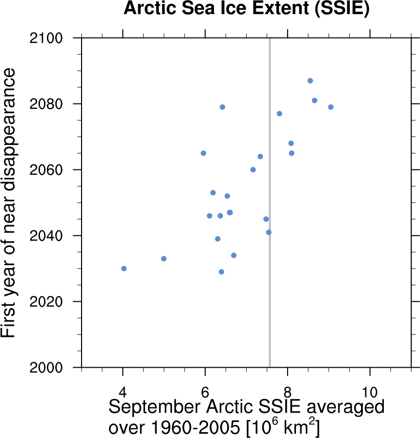Fig. 319 Scatter plot of mean historical September Arctic sea ice extent vs 1st year of disappearance (RCP8.5) (similar to IPCC AR5 Chapter 12, Fig. 12.31a).#
