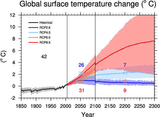 Fig. 316 Time series of global annual mean surface air temperature anomalie (relative to 1986–2005) from CMIP5 concentration-driven experiments.#
