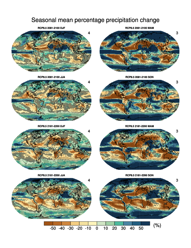 Fig. 317 Multi-model CMIP5 average percentage change in seasonal mean precipitation relative to the reference period 1986–2005 averaged over the periods 2081–2100 and 2181–2200 under the RCP8.5 forcing scenario. Hatching indicates regions where the multi-model mean change is less than one standard deviation of internal variability. Stippling indicates regions where the multi-model mean change is greater than two standard deviations of internal variability and where at least 90% of models agree on the sign of change#