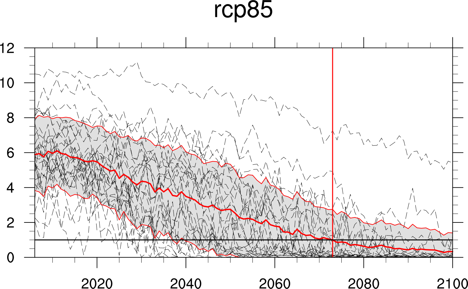 Fig. 320 Time series of September Arctic sea ice extent for individual CMIP5 models, multi-model mean and multi-model standard deviation, year of disappearance (similar to IPCC AR5 Chapter 12, Fig. 12.31e).#