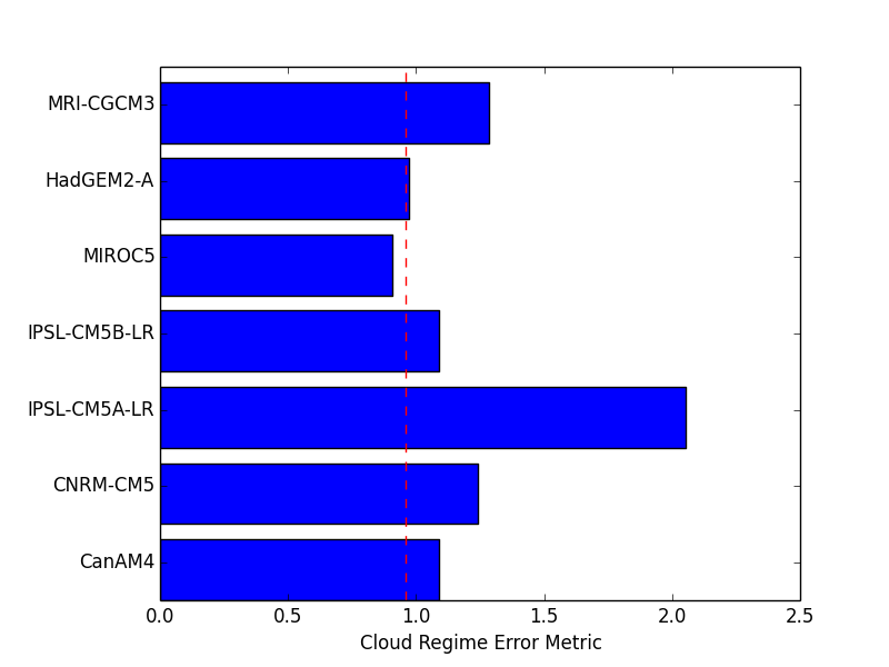 The radiative feedback from clouds remains the largest source of uncertainty in determining the climate sensitivity. Traditionally, cloud has been evaluated in terms of its impact on the mean top of atmosphere fluxes. However it is quite possible to achieve good performance on these criteria through compensating errors, with boundary layer clouds being too reflective but having insufficient horizontal coverage being a common example (e.g., Nam et al., 2012). Williams and Webb (2009) (WW09) propose a Cloud Regime Error Metric (CREM) which critically tests the ability of a model to simulate both the relative frequency of occurrence and the radiative properties correctly for a set of cloud regimes determined by the daily mean cloud top pressure, cloud albedo and fractional coverage at each grid-box. WW09 describe in detail how to calculate their metrics and we have included the CREMpd metric from their paper in ESMValTool, with clear references in the lodged code to tables in their paper. This has been applied to those CMIP5 models who have submitted the required diagnostics for their AMIP simulation (see Figure 8 below). As documented by WW09, a perfect score with respect to ISCCP would be zero. WW09 also compared MODIS/ERBE to ISCCP in order to provide an estimate of observational uncertainty. This was found to be 0.96 and this is marked on Figure 8, hence a model with a CREM similar to this value could be considered to have an error comparable with observational uncertainty, although it should be noted that this does not necessarily mean that the model lies within the observations for each regime. A limitation of the metric is that it requires a model to be good enough to simulate each regime. If a model is that poor that the simulated frequency of occurrence of a particular regime is zero, then a NaN will be returned from the code and a bar not plotted on the figure for that model.