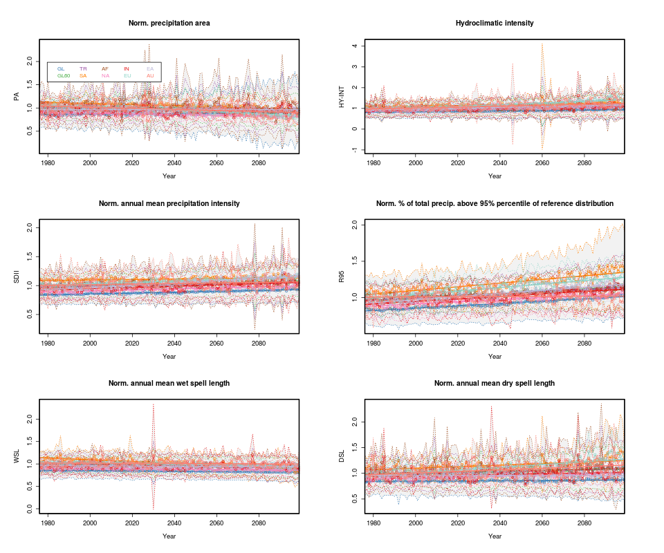 Fig. 180 Timeseries for multiple indices and regions for the ACCESS1-0 model, for the historical + RCP8.5 projection in the period 1976-2099, normalized to the 1976-2005 historical period.#