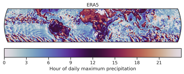 Fig. 108 Hour of maximum precipitation from ERA5 in the tropics (30°S-30°N) for the months June, July, August 2000.#