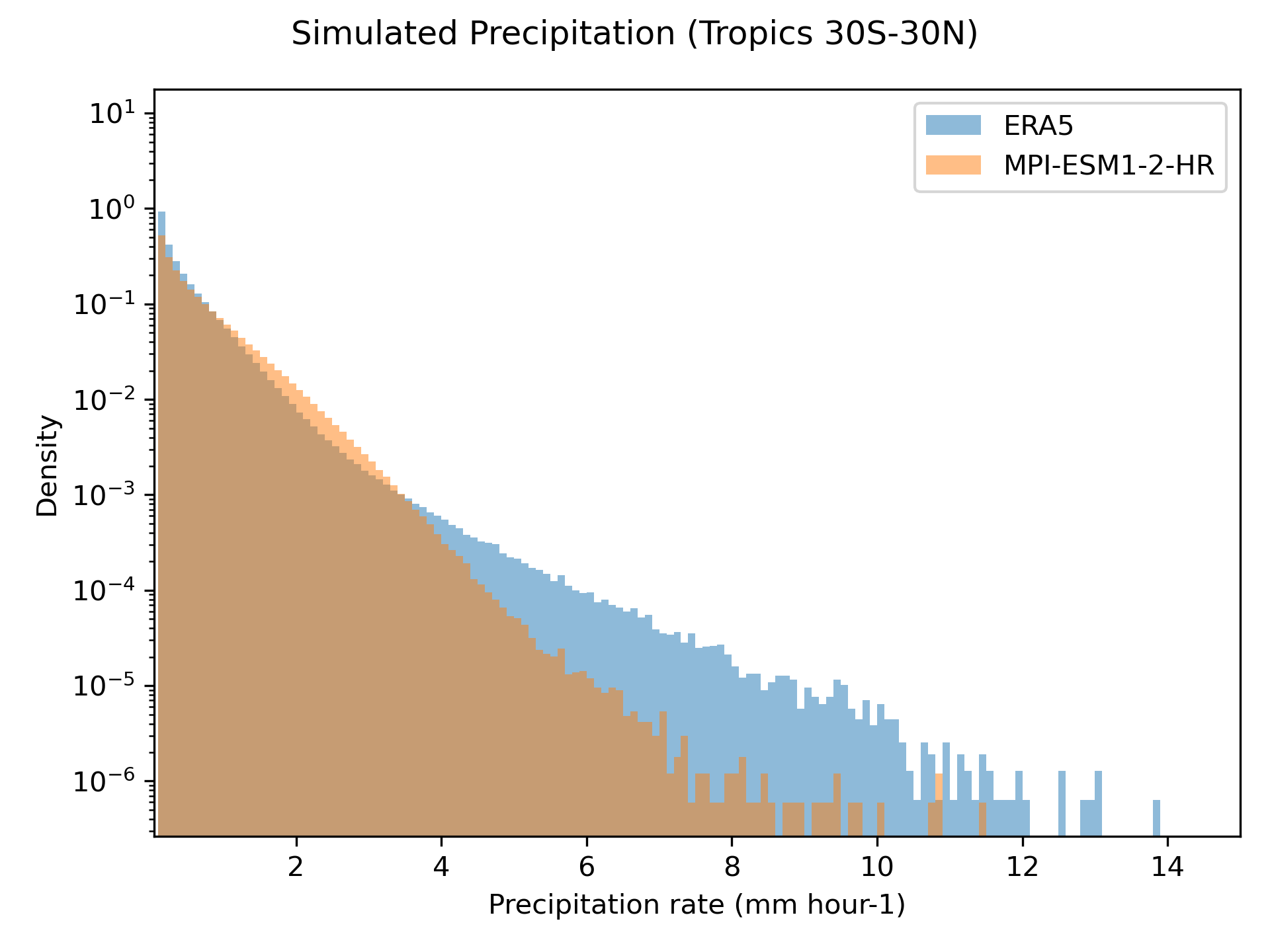 Fig. 107 Histogram of precipitation rates from MPI-ESM1-2-HR and ERA5 reanalysis 3-hourly data over the Tropics (30°S-30°N) for the years 1979-1980.#