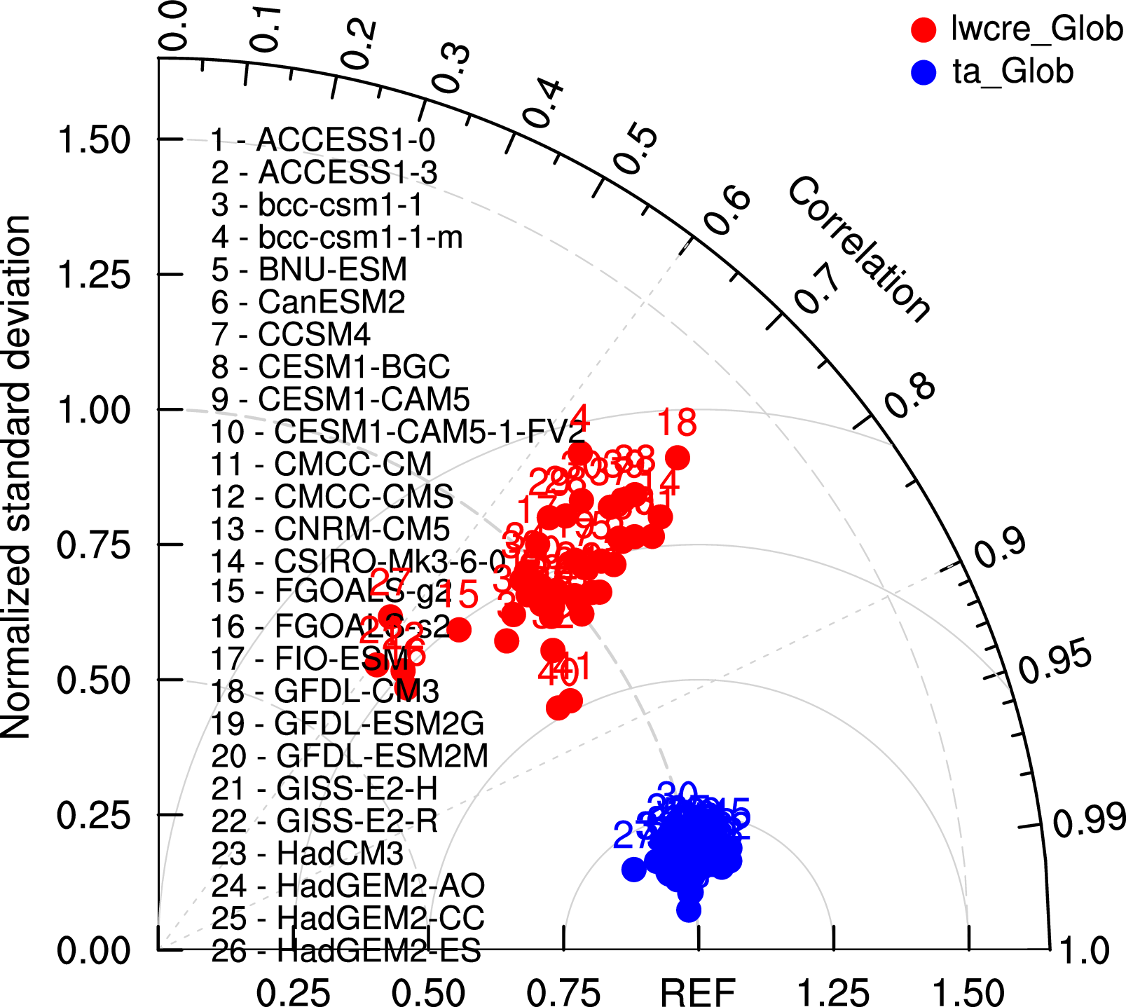 Fig. 232 Taylor diagram of globally averaged temperature at 850 hPa (ta) and longwave cloud radiative effect (lwcre) for different CMIP5 models (historical simulation, 1980-2005). Reference data (REF) are ERA-Interim for temperature (1980-2005) and CERES-EBAF (2001-2012) for longwave cloud radiative effect.#