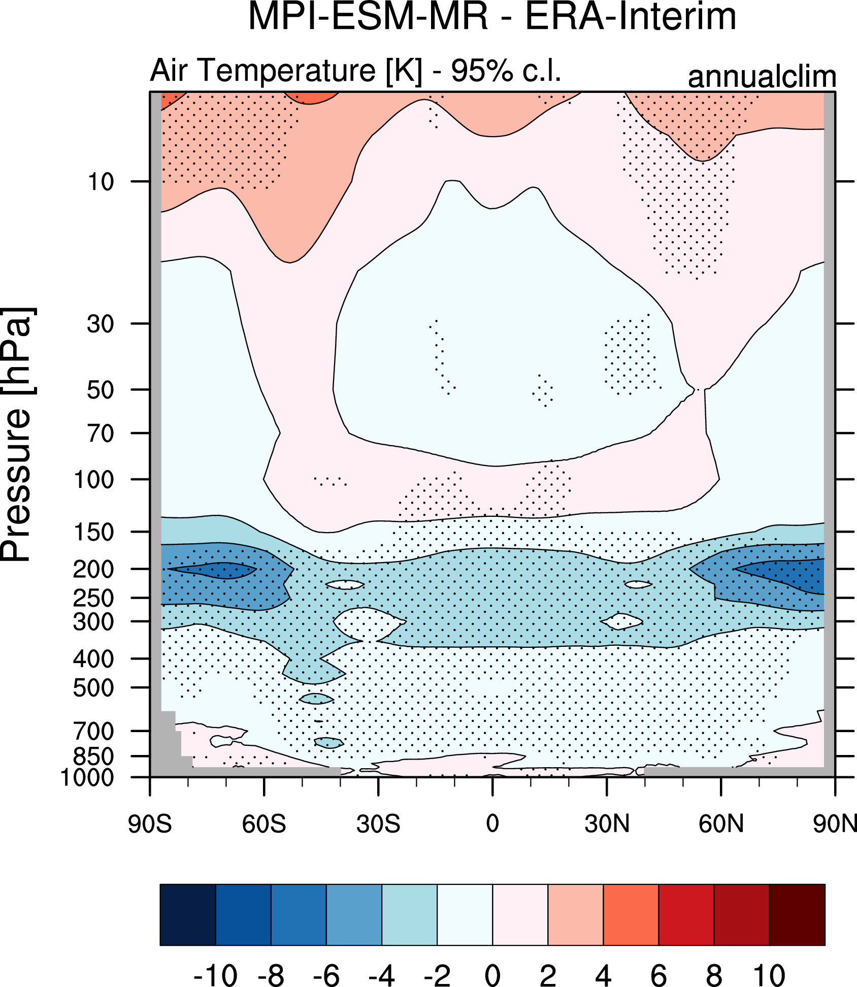 Fig. 233 Difference in annual mean of zonally averaged temperature (time period 1980-2005) between the CMIP5 model MPI-ESM-MR (historical simulation) and ERA-Interim. Stippled areas indicdate differences that are statistically significant at a 95% confidence level.#
