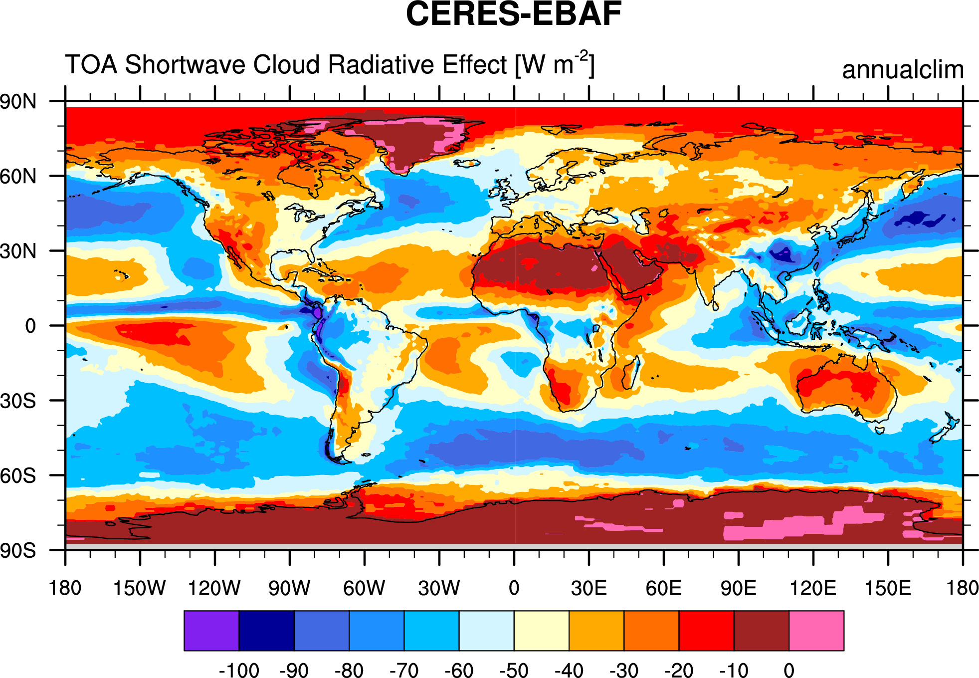 Fig. 234 Annual mean (2001-2012) of the shortwave cloud radiative effect from CERES-EBAF.#