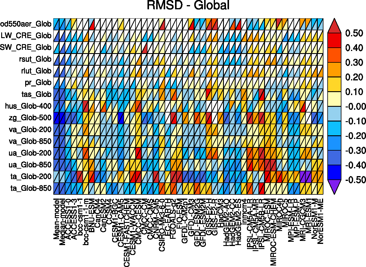 Fig. 235 Relative space-time root-mean-square deviation (RMSD) calculated from the climatological seasonal cycle of CMIP5 simulations. A relative performance is displayed, with blue shading indicating better and red shading indicating worse performance than the median of all model results. A diagonal split of a grid square shows the relative error with respect to the reference data set (lower right triangle) and the alternative data set (upper left triangle). White boxes are used when data are not available for a given model and variable.#