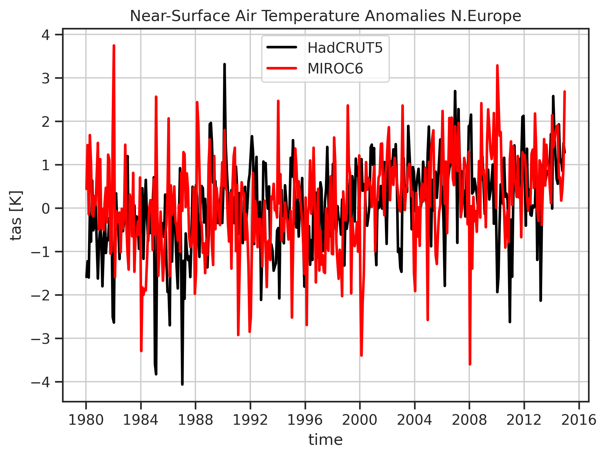 Fig. 134 Time series of near-surface air temperature anomalies from MIROC6 compared with HadCRUT5 for N.Europe for the years 1980 to 2014 (reference period 1980 to 2009). Created with recipe_ref_timeseries_region.yml.#
