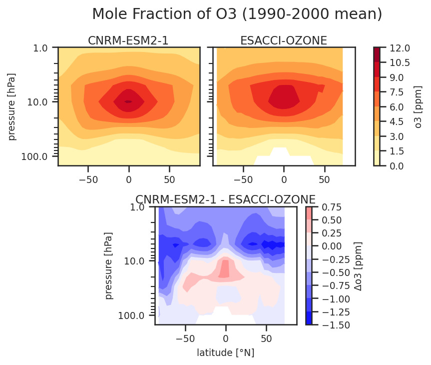 Fig. 133 Zonal mean vertically resolved ozone climatology from CNRM-ESM2-1 compared with ESACCI-OZONE for the years 1990 to 2000. Created with recipe_ref_ozone.yml.#