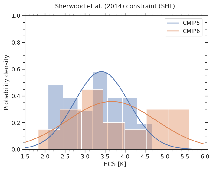 Fig. 256 Probability densities for the constrained ECS (solid lines) and the unconstrained model ensembles (histograms) of the emergent relationship shown in the figure above.#