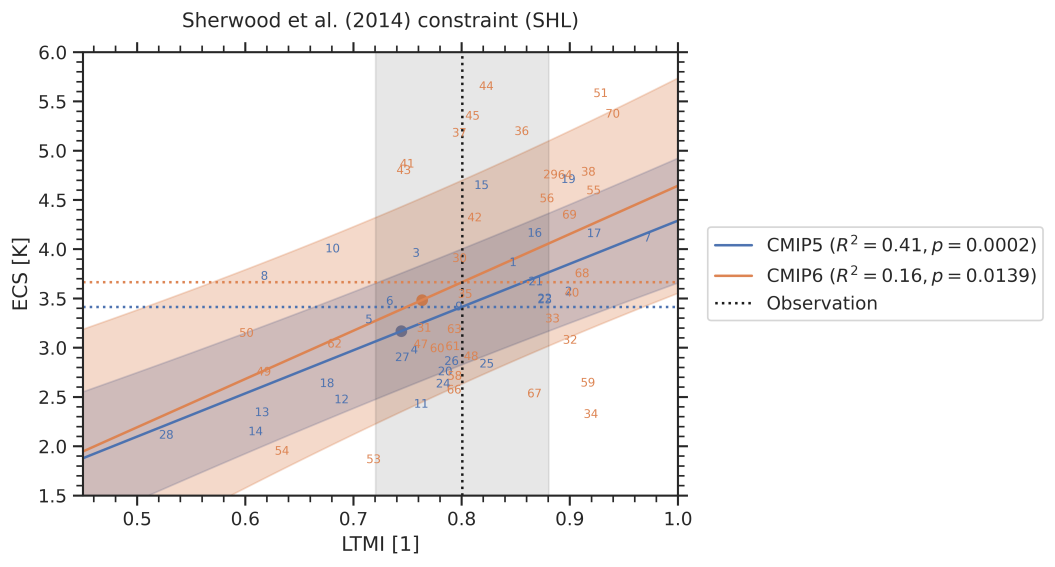 Fig. 255 Emergent relationship (solid blue and orange lines) of the Sherwood et al. (2014) emergent constraint, which is based on the lower tropospheric mixing index (LTMI). The numbers correspond to individual CMIP models. The shaded area around the regression line corresponds to the standard prediction error, which defines the error in the regression model itself. The vertical dashed black line corresponds to the observational reference with its uncertainty range given as standard error (gray shaded area). The horizontal dashed lines show the best estimates of the constrained ECS for CMIP5 (blue) and CMIP6 (orange). The colored dots mark the CMIP5 (blue) and CMIP6 (orange) multi-model means.#