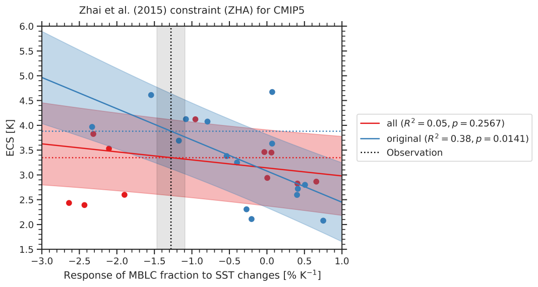 Fig. 257 Emergent relationship of the Zhai et al. (2015) emergent constraint for different subsets of CMIP5 models. Blue circles show the 15 CMIP5 models used in the original publication (except for CESM1-CAM5); the solid blue line and blue shaded area show the emergent relationships evaluated on these models including the uncertainty range. In this study, 11 more CMIP5 models have been added (red circles). The corresponding emergent relationship that considers all available CMIP5 models is shown in red colors. This relationship shows a considerably lower coefficient of determination (\(R^2\)) and higher p-value than the relationship using the original subset of CMIP5 models. The vertical dashed line and shaded area correspond to the observational reference, and the horizontal dashed lines show the corresponding ECS constraints using this observation.#