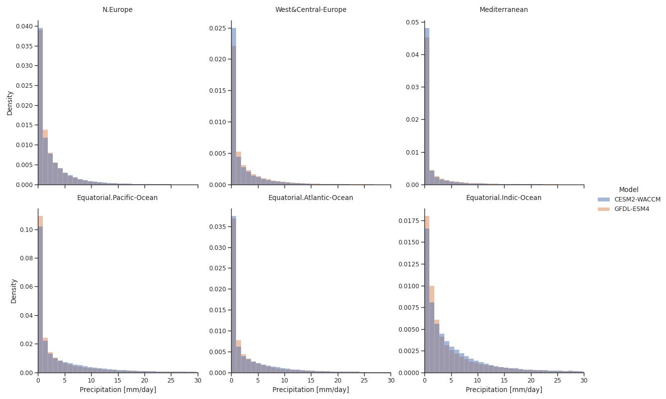 Fig. 127 Spatiotemporal distribution of daily precipitation in the period 2005-2014 for six IPCC AR6 regions simulated by two Earth system models (CESM2-WACCM and GFDL-ESM4). Each day in each grid cell in the corresponding regions is considered with equal weight.#