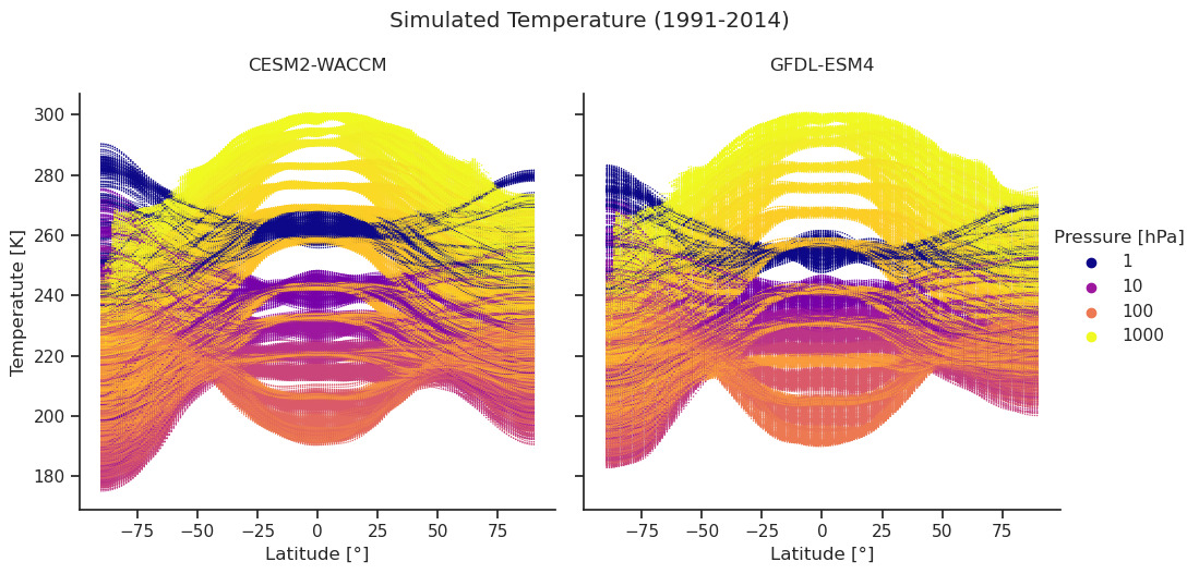 Fig. 126 Monthly and zonal mean temperatures vs. latitude in the period 1991-2014 for two Earth system models (CESM2-WACCM and GFDL-ESM4). Colors visualize the corresponding pressure levels.#